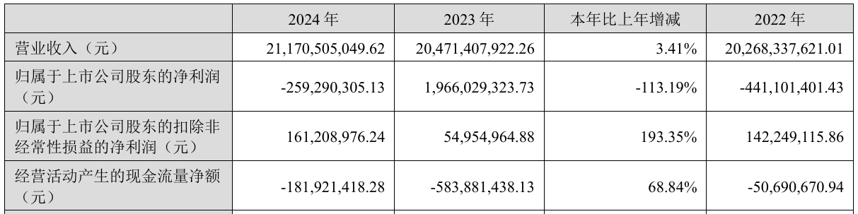 2024年,公司实现营业总收入211.71亿元,同比增长3.41%;归母净利润亏损2.59亿元,上年同期盈利19.66亿元。今年一季度,公司实现营业总收入47.59亿元,同比下降1.69%;归母净利润1.08亿元,同比扭亏。