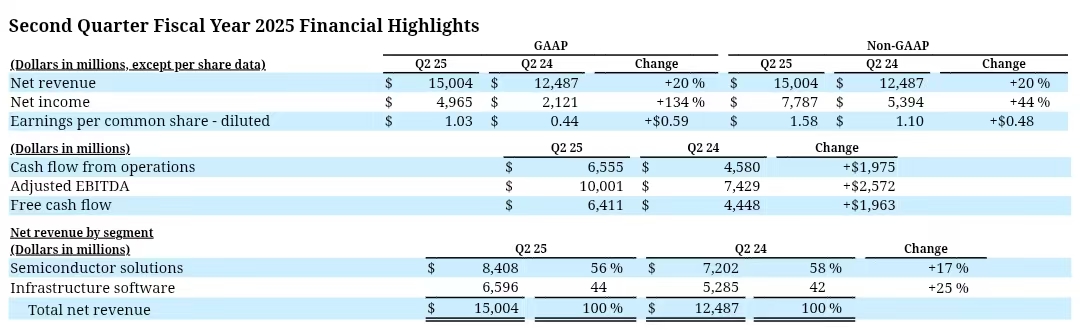 当地时间6月5日,半导体厂商博通(Nasdaq:AVGO)发布截至2025年5月4日的2025财年第二季度财报。财报显示全国前三配资公司,该季度博通营收150.04亿美元,同比增长20%,超过此前的业绩指引149亿美元,也略高于市场预期的149.7亿美元;(GAAP)净利润49.65亿美元,同比增长134%;调整后EBITDA100.01亿美元,高于去年同期的74.29亿美元;毛利率79.4%,高于此前的业绩指引。